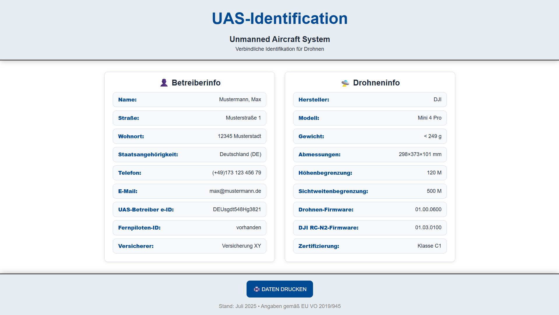 Ăbrigens: Rein rechtlich reichtâs aus, wenn du die eID sichtbar auf der Drohne platzierst â Hauptsache, sie ist lesbar.