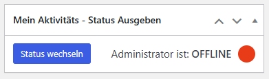 Ich bin nicht ich, wenn ich nicht spielen würde. 🙂 Da hatte ich mir vor einiger Zeit (hierfür sind Release Notes praktisch) im Bereich Blogaktivität (Seitenleiste) einen Aktivitätsstatus eingebunden. Diesen habe ich nun so erweitert, dass er nicht direkt aktiv ist, sofern ich mich in WordPress anmelde, sondern erst, nachdem ich auf meinem Button (Status wechseln) im Dashboard geklickt habe.